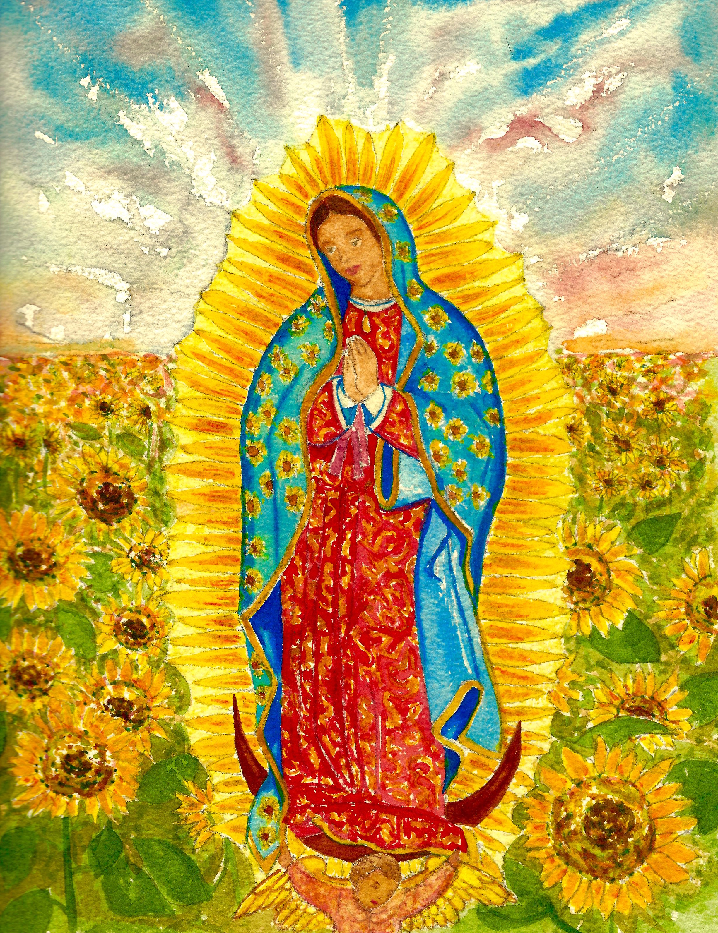 Dedication page illustration for the upcoming release of the bilingual version of The Three Sunflowers. La Virgen de Guadalupe was the inspiration for the Gloria character in the book….